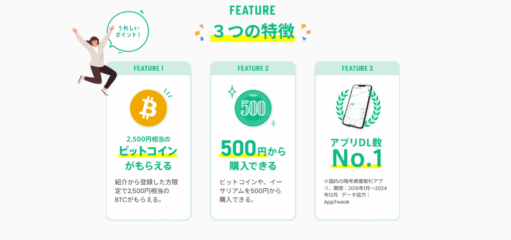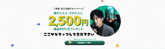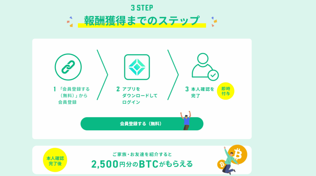 紹介リンクを経由して登録し、本人確認(KYC)を完了すると、最大2,500円相当のビットコインが自動的に付与されます。紹介した側にもビットコインがプレゼントされるため、双方にメリットがあります。登録費用は無料で、入金や取引をしなくても特典を受け取ることができます。