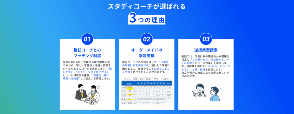 スタディコーチは、全国どこからでも最難関大学の現役生の指導を受けられる完全オンライン指導塾です。